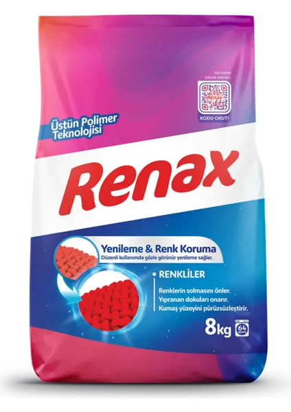 Renax Renkliler Toz Çamaşır Deterjanı, güçlü enzim etkisi ile dokuları onarır. Yeni enzim teknolojisi ile kıyafetlerinizin yüzeyini 3. yıkamadan sonra leştirmeye ve onarımını sağlanmaya başlar. Üstün polimer teknolojisi ile canlı renkleri ! Renklerin kumaşı bırakmasını engeller. Düzenli kullanımda gözle görülür renk koruma sağlar.